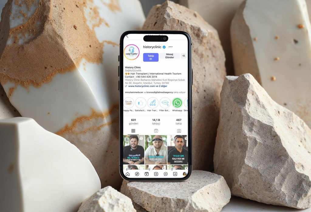 History Clinic, saç ekimi alanında hizmet veren ve uluslararası danışanlara çözüm sunan güçlü bir markadır. Ajans olarak History Clinic ile yürüttüğümüz sosyal medya çalışmaları, markanın dijital dünyada daha görünür, ulaşılabilir ve güvenilir bir konuma gelmesini sağlamak amacıyla stratejik bir şekilde planlandı. Hedefimiz; saç ekimi gibi uzmanlık gerektiren bir alanda, potansiyel hastaların güvenini kazanmak, doğru bilgilendirme yapmak ve markayı dijital ortamda büyütmekti.